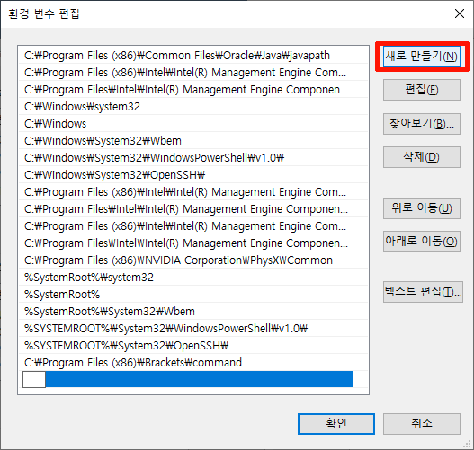 환경 변수 > 새로 만들기 > 새 사용자 변수