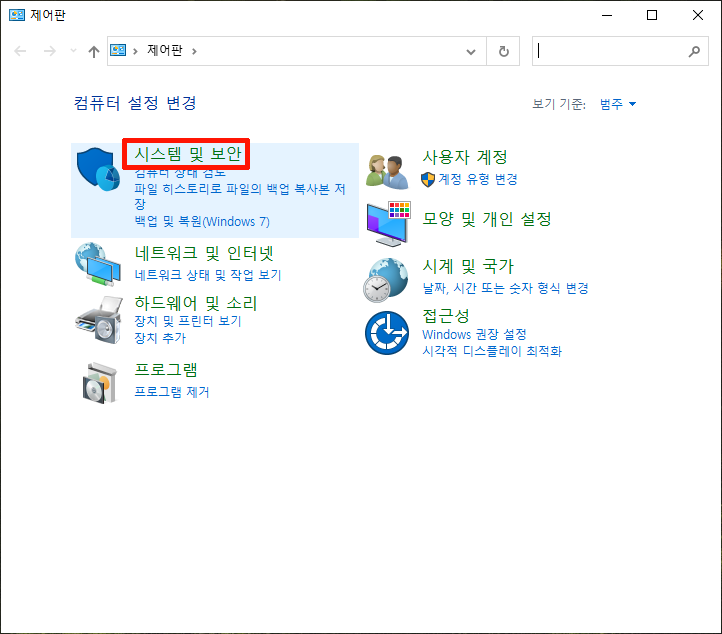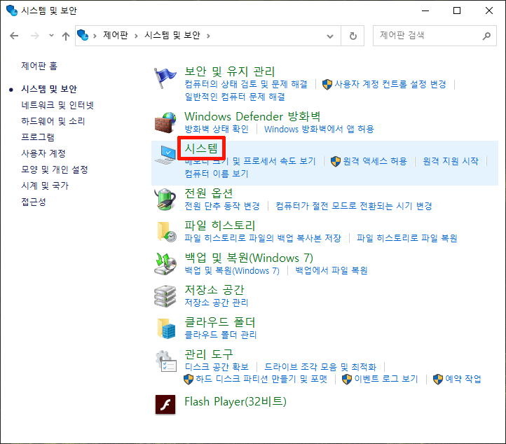 제어판 > 시스템 및 보안 > 시스템 클릭