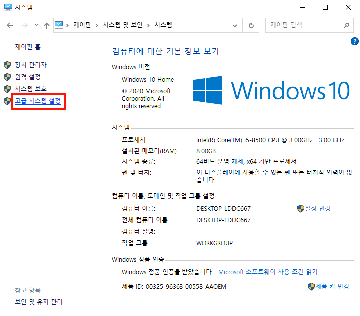 제어판 > 시스템 및 보안 > 시스템 > 고급 시스템 설정 클릭